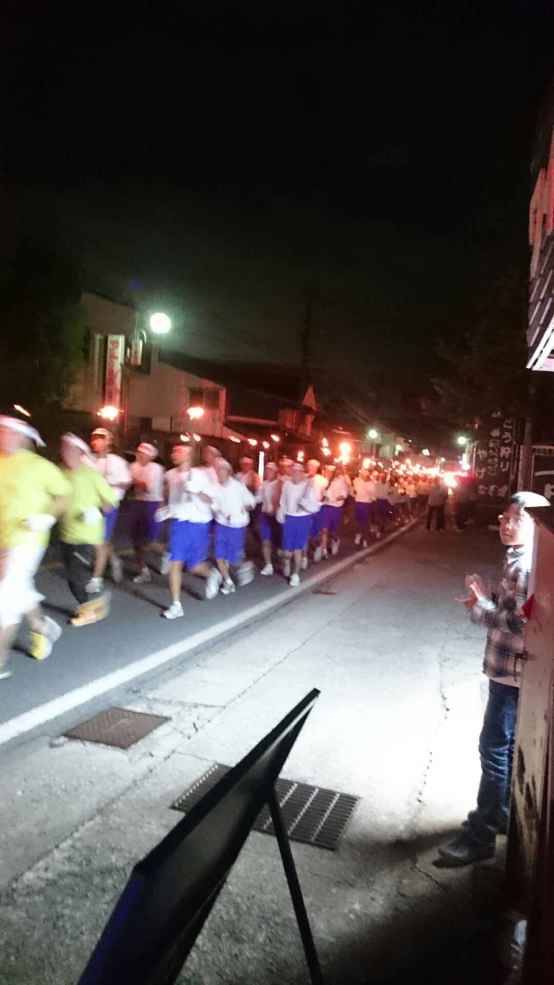 勝沼中2,3年生男子による聖火隊が消防車と共に山へ走っていくところです